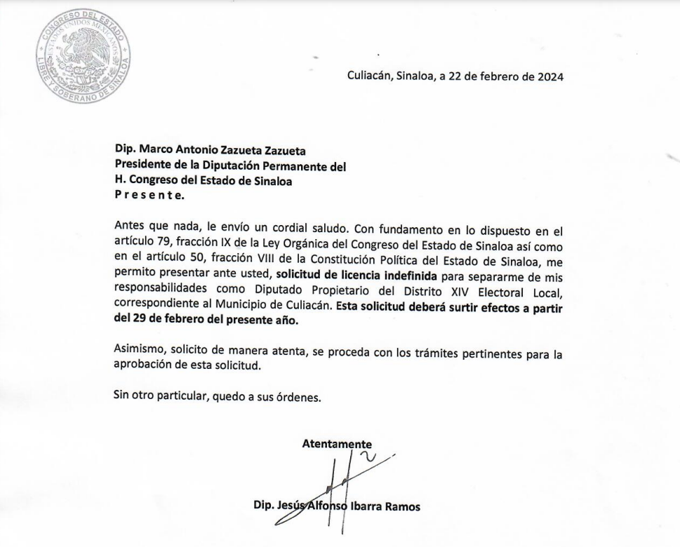 Jesús Alfonso Ibarra Ramos, Diputado local en el Congreso de Sinaloa, solicitó licencia para dejar sus funciones y poder contender en el proceso electoral 2024, en el cual aspira a un cargo federal.