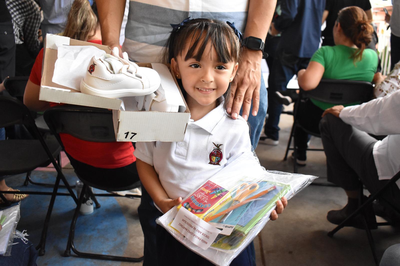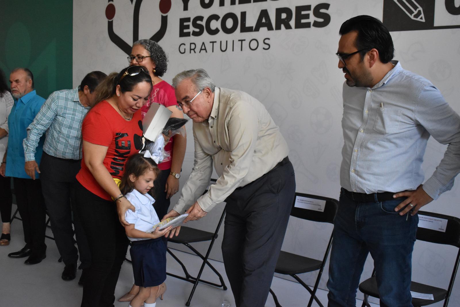 Tras el discurso de la representante de los beneficiarios, pasaron alumnos de preescolar, primaria y secundaria a recibir su paquete de uniformes, calzado, así como útiles escolares como símbolo de la inauguración de la campaña de dotación gratuita.