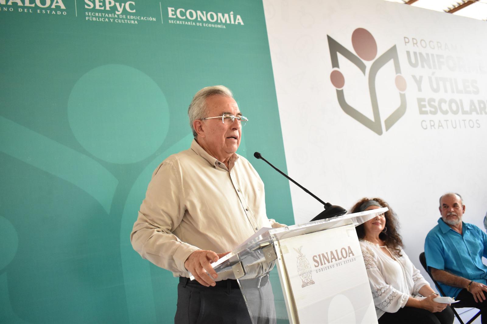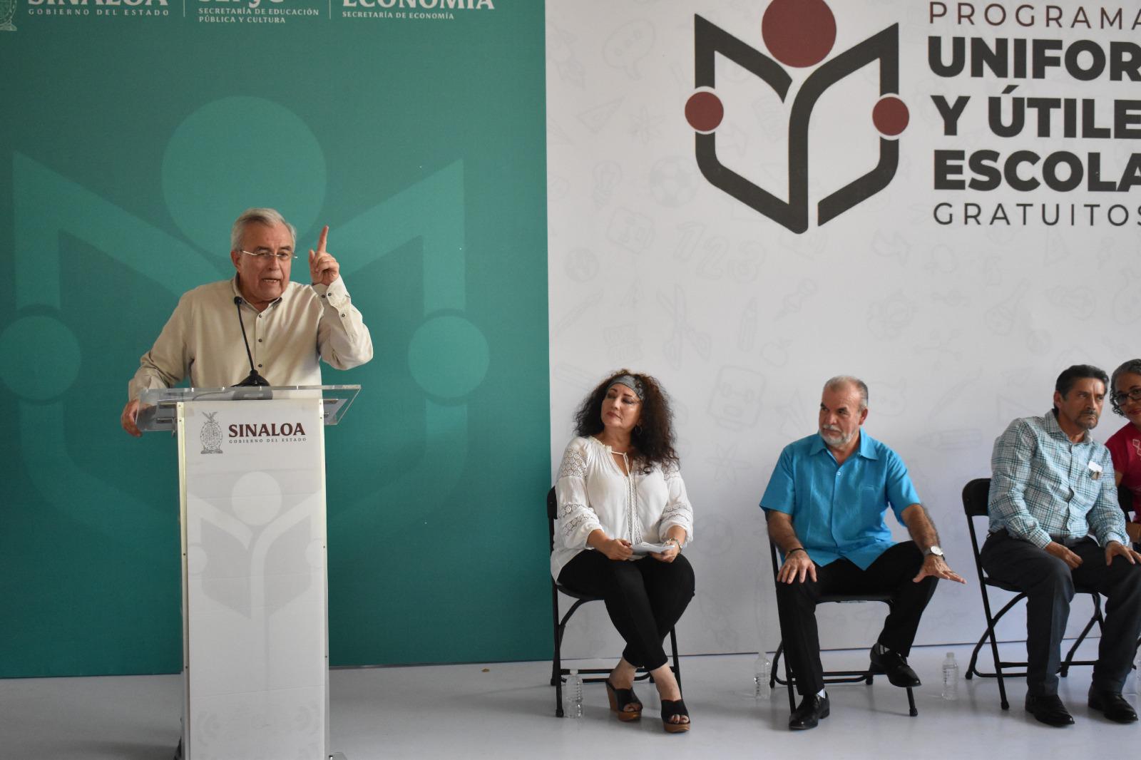El Gobernador Rubén Rocha Moya dio el banderazo de inicio al programa de canje de uniformes y útiles escolares gratuitos, la mañana de este lunes.