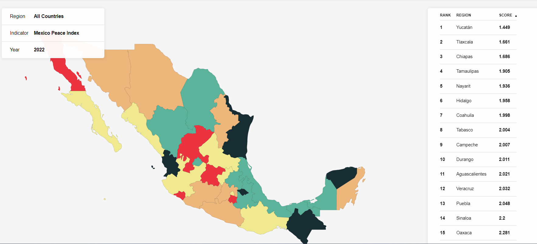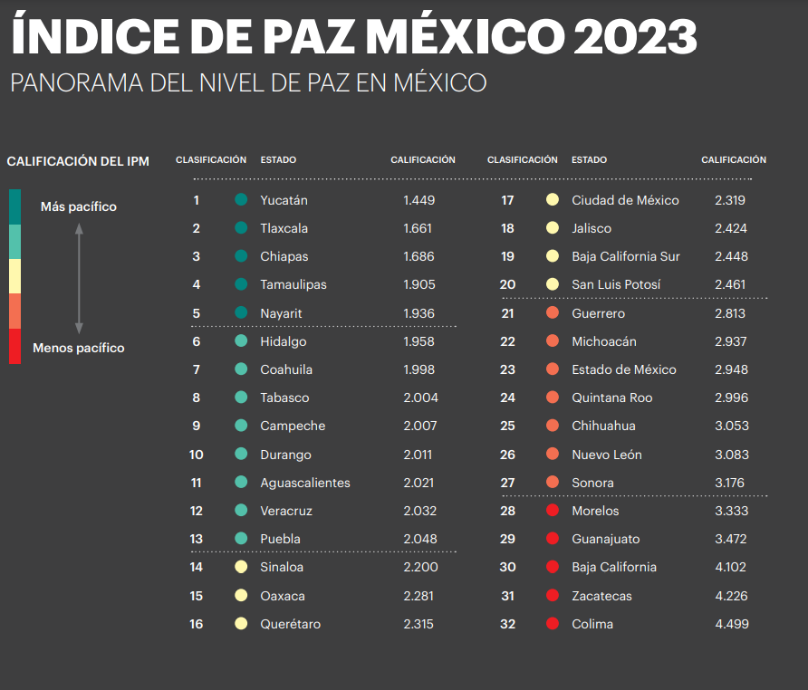 En los claroscuros, destacaron como las entidades más pacíficas son Yucatán, Tlaxcala, Chiapas, Tamaulipas y Nayarit, mientras que en el contraste negativo aparece Colima como el estado menos pacífico seguido por Zacatecas, Baja California, Guanajuato y Morelos.