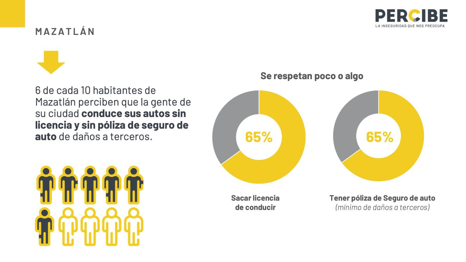 En el caso de Mazatlán, 6 de cada 10 habitantes perciben que la gente de su ciudad conduce sus autos sin licencia y sin póliza de seguro de auto de daños a terceros, siendo estas las dos reglas que predominantemente se respetan poco o algo.