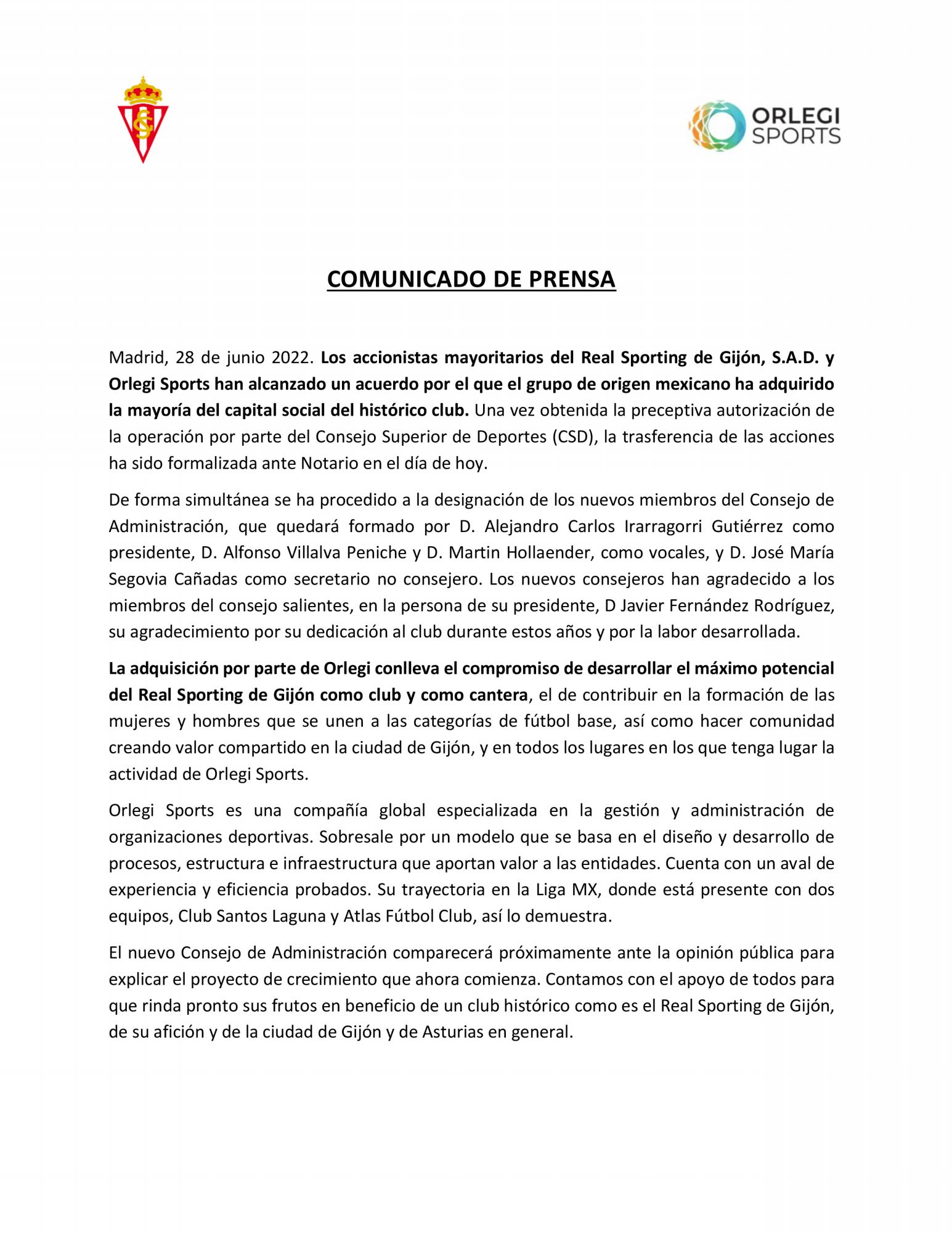 La institución dio a conocer la noticia mediante un comunicado, en el cual señaló que “los accionistas mayoritarios del Real Sporting de Gijón, S.A.D. y Orlegi Sports han alcanzado un acuerdo, por lo que el grupo de origen mexicano ha adquirido la mayoría del capital social del histórico club”.