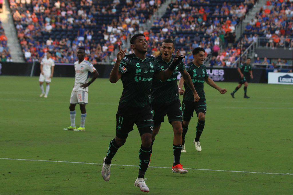 Desde el inicio los dos equipos fueron a buscar la victoria. Santos, que no había anotado un gol en tiempo regular de esta Leagues Cup, abrió el marcador al minuto cinco. Chidozie Awaziem se equivocó intentando dar un pase y el balón le quedó a Anthony Lozano dentro del área para vencer a Roman Celentano.