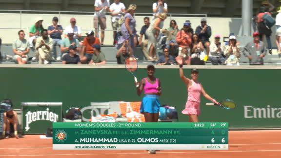 Olmos y la estadounidense Asia Muhammad hicieron valer su condición de favoritas para imponerse a las belgas Maryna Zanevska y Kimberley Zimmermann por sets de 6-4 y 6-0, en un partido que duró una hora con 23 minutos.