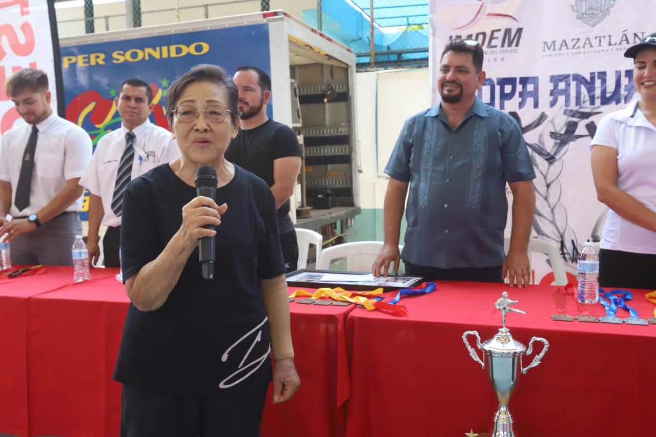 Acudieron a la mesa de honor Esperanza Kasuga, directora general de Alimentos Kay y patrocinadora del evento; Elizabeth Peraza Mendoza, directora ejecutiva de Editorial Noroeste; Fabiola Verde Rosas, directora del Instituto Municipal del Deporte de Mazatlán; Juan Manuel Salazar Licona, sensei local y denominado el padre de este deporte en Sinaloa, acompañado de su esposa, la también sensei Eliza Gómez.