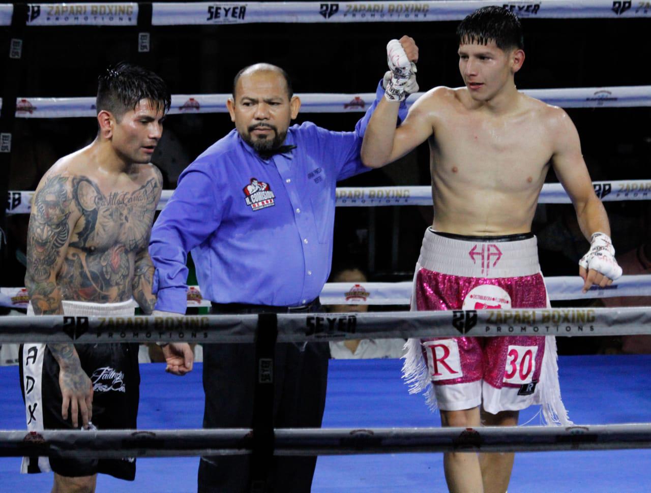 El vecino de la Colonia Montuosa (20-0) se vio dominador de principio a fin ante un experimentado Mario “Triturador” Díaz (24-6), para vencerle en el octavo asalto en peso Supergallo, luego que el tercero sobre la superficie Adrián Pineda pusiera fin al combate al decretar la descalificación del pugilista de Aguascalientes, después de reincidir en golpes bajos.