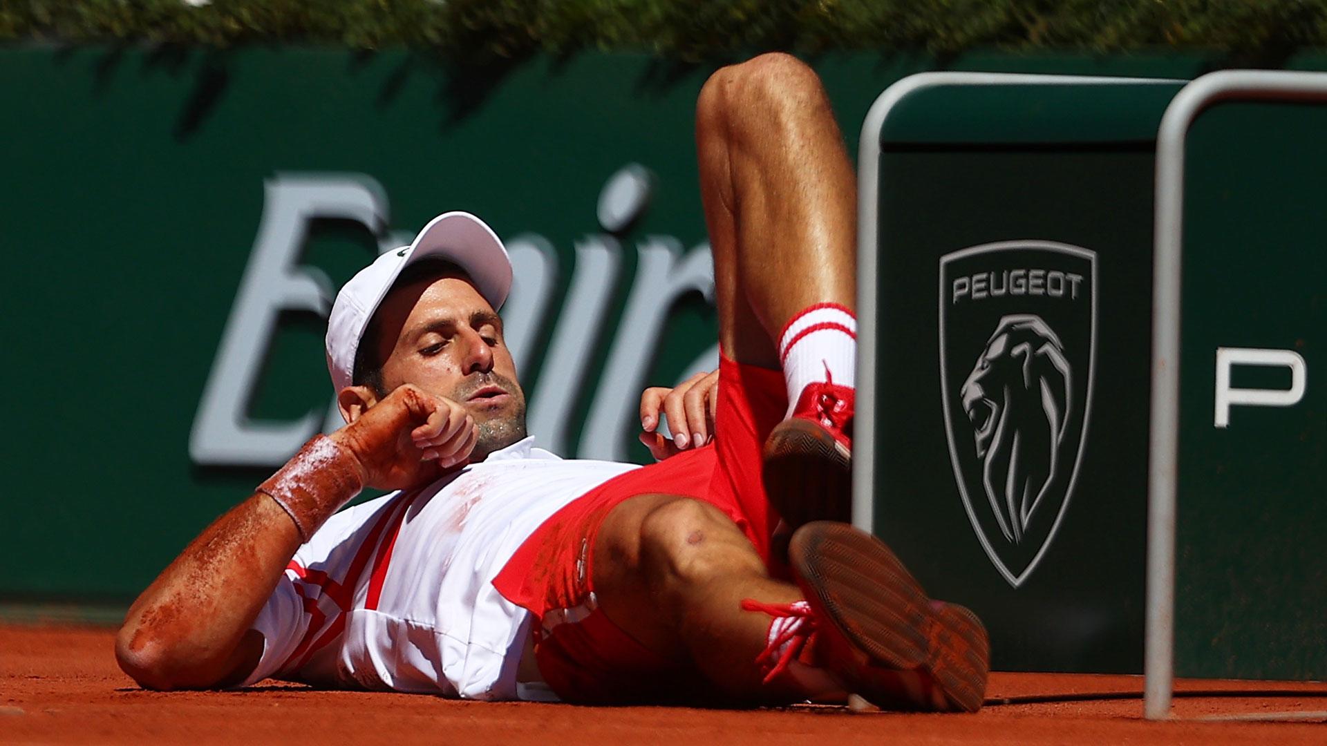 A la media hora de partido, todo igualado en el marcador (3-3), Djokovic sufrió una caída corriendo a por una bola junto a la red, y terminó tirado por los suelos en el lado de la pista de su oponente.