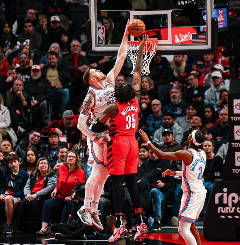 En el Thunder, Isaiah Hartenstein regresó tras perderse cinco partidos y fue clave con un doble-doble (14 puntos y 11 rebotes), además de seis asistencias. El equipo dominó ampliamente los puntos en la pintura, superando 52-22 a los Blazers.