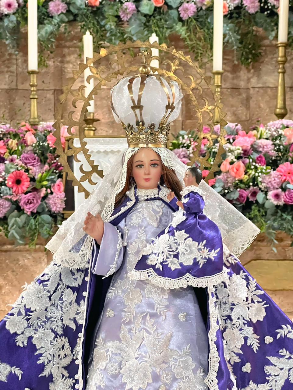Un vestido para la virgen en color lila, un manto azul rey y aplicaciones en color blanco, y un ropón en azul para el niño Jesús, elaboró Dora Elva.