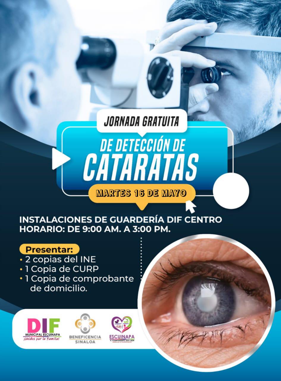 El DIF Escuinapa llevará a cabo este 16 de mayo una Jornada Gratuita de Detección de Cataratas, en coordinación con la Secretaría de Salud y el Gobierno municipal, para beneficio de pobladores del sur de Sinaloa.