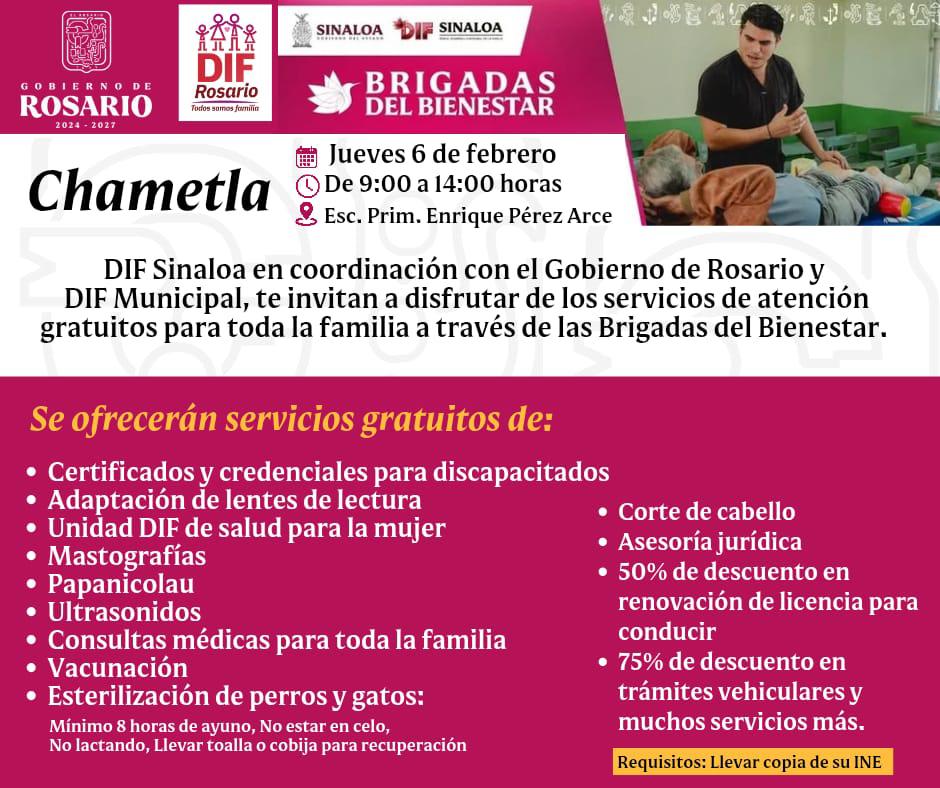 EL ROSARIO._ Con el anuncio de que el próximo jueves 6 de febrero llegarán las Brigadas del Bienestar a Chametla, invitan a la población a aprovechar los diferentes servicios gratuitos que ofrece el Gobierno del Estado a través de DIF Sinaloa.