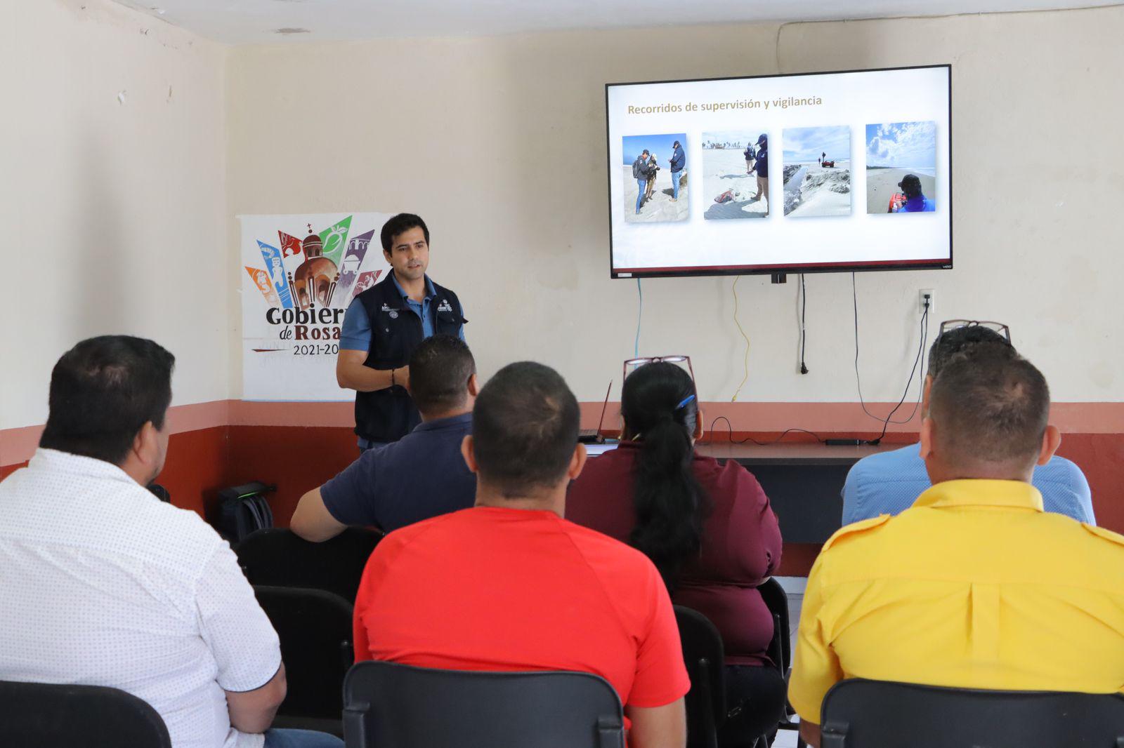 EL ROSARIO._ Con la finalidad de informar las bondades, limitaciones, territorio y acciones de conservación del área natural protegida en la categoría de Santuario Huizache-Caimanero, personal de la Comisión Nacional de Áreas Naturales Protegidas encabezaron una reunión con trabajadores de distintas áreas del Ayuntamiento.