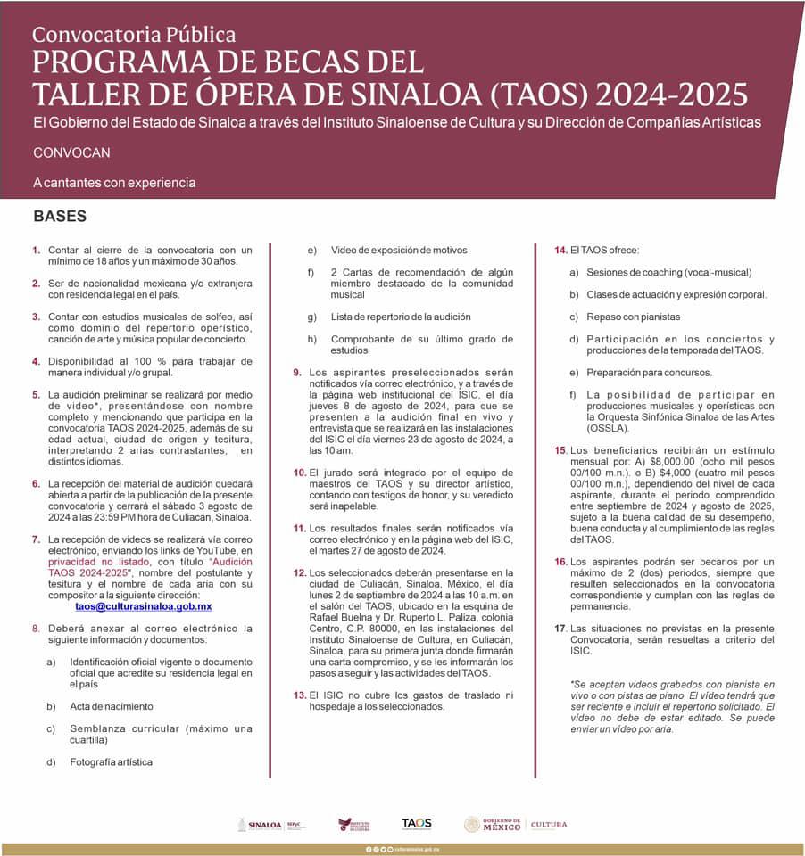 Para más detalles y envío de material, pueden escribir a: taos@culturasinaloa.gob.mx y anexar la siguiente información y documentos: Identificación oficial vigente o documento oficial que acredite su residencia legal en el país; acta de nacimiento; semblanza curricular (máximo una cuartilla); fotografía artística; carta de exposición de motivos; carta de recomendación de algún miembro destacado de la comunidad musical; lista de repertorio de la audición, y comprobante de su último grado de estudios.