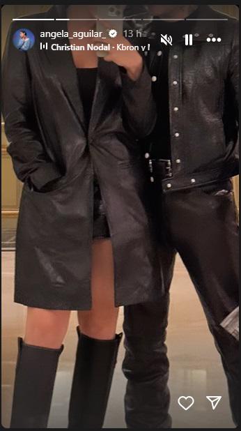A través de una historia de Instagram, se ve a la pareja posando frente a un espejo con atuendos coordinados en negro y detalles de piel, sin mostrar sus rostros.