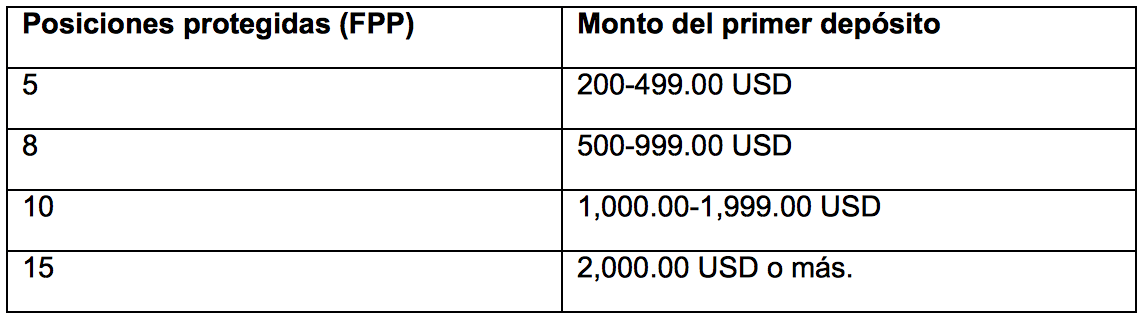 Los FPP serán dados en diferentes cantidades de acuerdo al monto mínimo del primer depósito. Para comprender este concepto, a continuación se muestra una tabla especificando el monto mínimo y el número de FPP que se ofrecen.