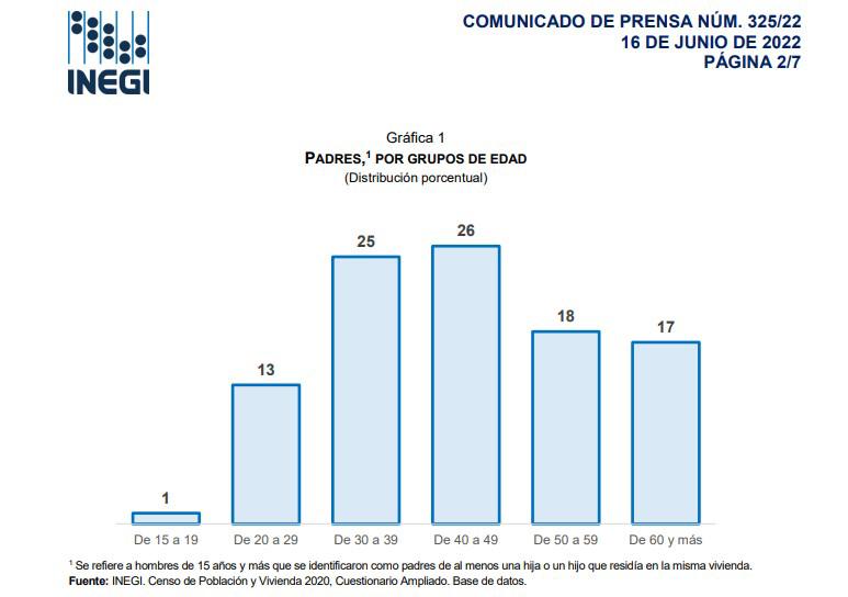 El Censo de Población y Vivienda 2020 estima que en México había 44.9 millones de hombres de 15 años y más. De ellos, 21.2 millones (47 por ciento) se identificaron como padres. La edad promedio fue de 45 años.