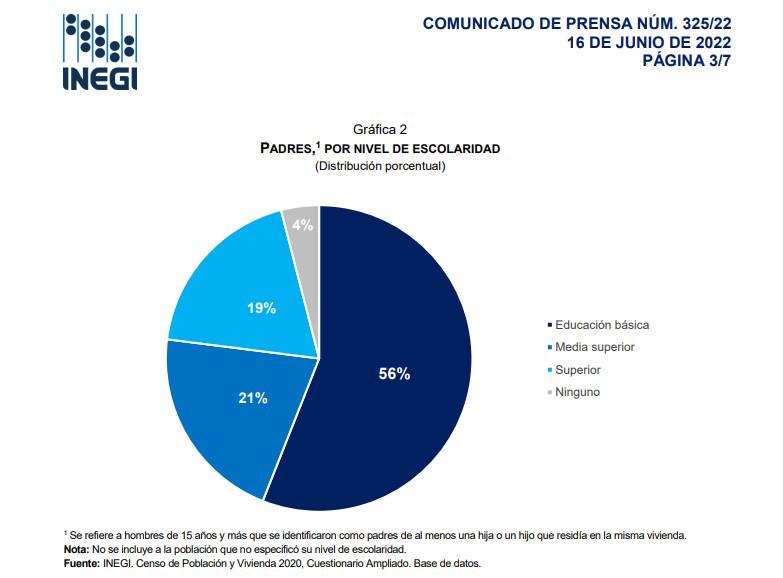 El nivel de escolaridad que alcanzan los padres no solo puede mejorar el nivel socioeconómico familiar; también influencia de manera positiva el rendimiento escolar de las y los hijos. Los datos del Censo de Población y Vivienda 2020 registraron que, por nivel de escolaridad, 56 por ciento de los padres de familia identificados en la vivienda solo contaba con estudios de educación básica, 21 por ciento tenía estudios de nivel medio superior, 19 por ciento estudios de nivel superior y 4 por ciento indicó no tener escolaridad alguna.
