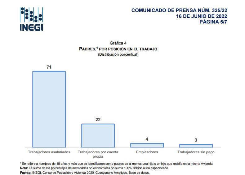 Con base en el Censo de Población y Vivienda 2020, 18.4 millones (87 por ciento) de hombres identificados como padres formaron parte de la Población Económicamente Activa (PEA): 97 por ciento se ocupaba en alguna actividad económica.