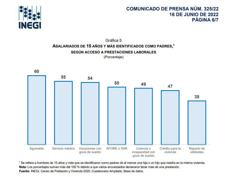 En cuanto al tipo de prestaciones, 60 por ciento recibió aguinaldo, 55 por ciento contó con servicio médico y 54 por ciento tuvo vacaciones con goce de sueldo. Además, 50 por ciento de los padres asalariados tenía AFORE o SAR (ahorro para el retiro); 49 por ciento tuvo licencia o incapacidad con goce de sueldo, 47 por ciento contó con acceso a crédito para la vivienda y 38 por ciento recibió reparto de utilidades.