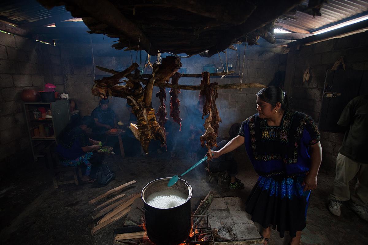 Esta es una clásica cocina tsotsil. La carne de res recibe el humo del fuego. Arriba de la carne, cuelga un gran montón de leña. Del techo también cuelgan manojos de mazorcas: las semillas de la siembra. Gallinas entran y salen del lugar. En la oscuridad, las ocho hermanas de Díaz Sántiz hablan en tsotsil mientras pican verdura.