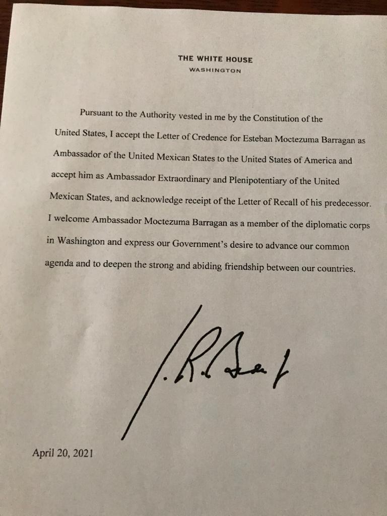 La Oficina de Jefatura de Protocolo del Departamento de Estado de Estados Unidos notificó a la Secretaría de Relaciones Exteriores (SRE) mexicana, que las cartas credenciales de Esteban Moctezuma Barragán, las cuales lo acreditan como embajador extraordinario y plenipotenciario de México en Estados Unidos, fueron aceptadas por el presidente Joseph Biden.