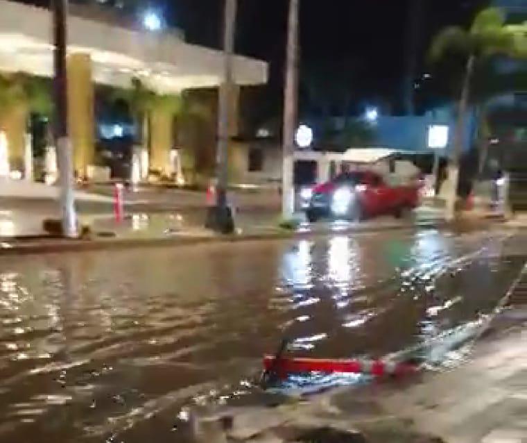 Con la primera lluvia, paso peatonal en la Avenida Camarón Sábalo, en Mazatlán, provoca inundaciones