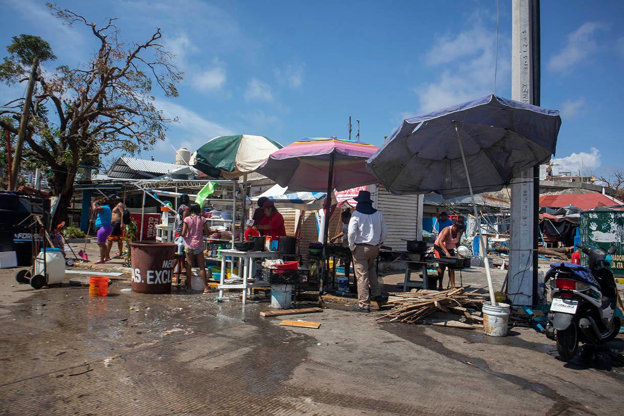 Afuera de las dos playas la gente que tiene una fonda o un pequeño negocio de ropa, que también fueron destruidos, hacen fila para que les den agua.