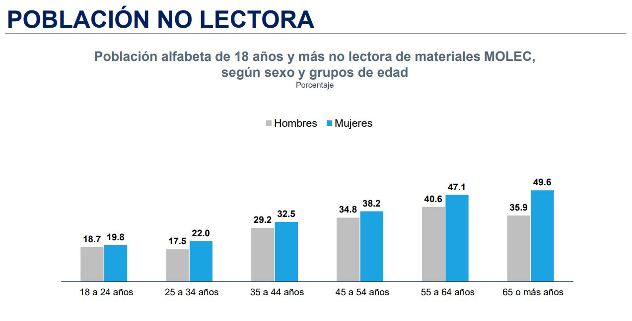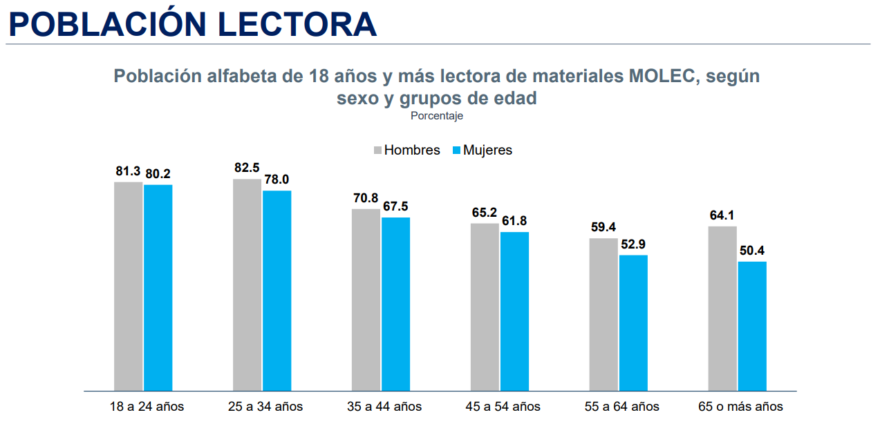 “En los grupos más jóvenes (18 a 24 y 25 a 34 años) el comportamiento lector entre mujeres y hombres fue similar: ocho de cada 10 personas leen. En el caso de las mujeres, el descenso fue gradual y llegó a cinco de cada 10 que leen en el grupo de 65 años y más. En el caso de los hombres el descenso fue menor: para este mismo grupo de edad, seis de cada 10 eran lectores”, se informa en el Molec.