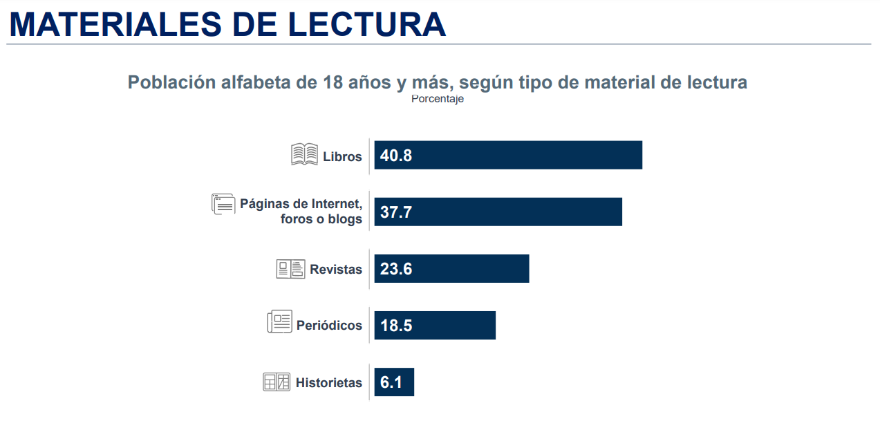 También se informa que por tipo de material de lectura, los libros tuvieron la mención más alta entre la población lectora: el 40.8 por ciento señaló haber leído, al menos, un libro en los últimos 12 meses; el 37.7 por ciento mencionó la lectura de páginas de Internet, foros o blogs; 23.6 por ciento dijo que leyó revistas; 18.5 por ciento, periódicos y 6.1 por ciento, historietas. Entre 2016 y 2023, disminuyó la población lectora de periódicos y revistas de 28.1 y 17.9 puntos porcentuales, respectivamente.