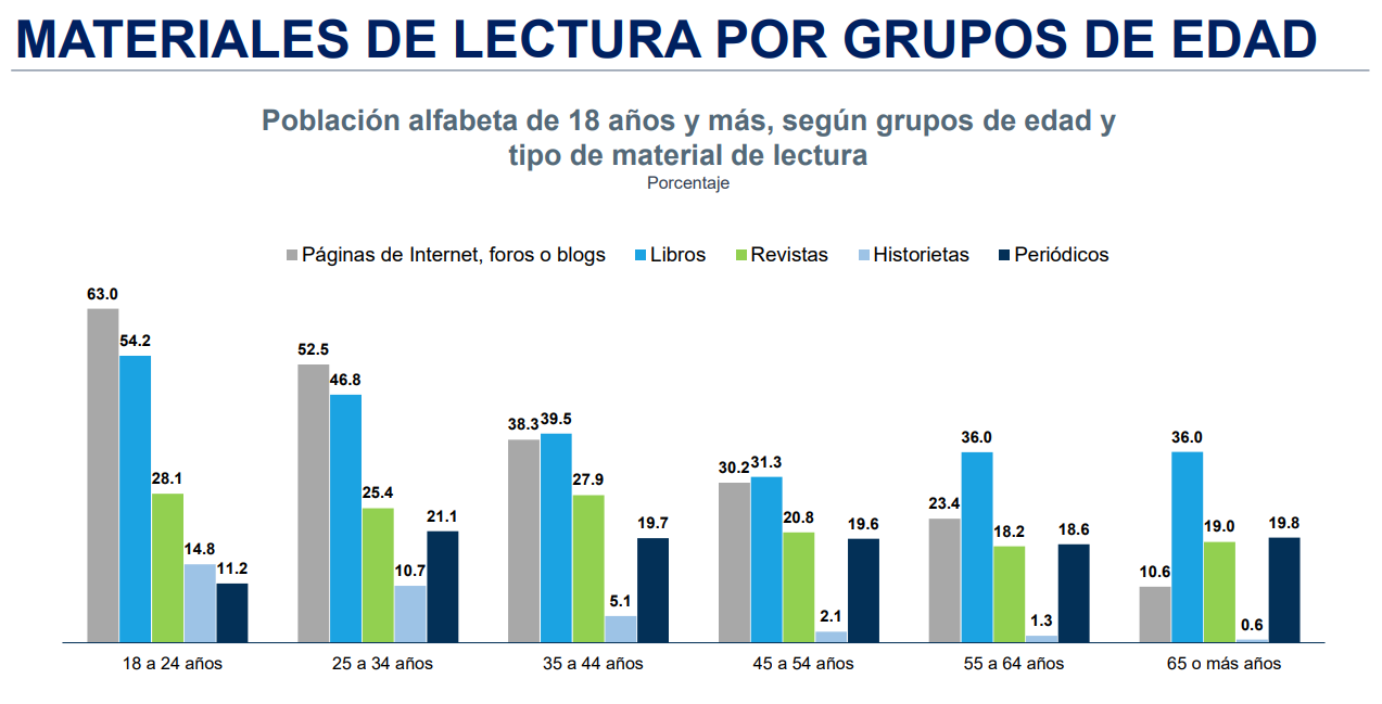 “Los materiales que más leen las personas dentro de estas edades fueron: páginas de Internet, foros o blogs (63.0 y 52.5 por ciento, respectivamente), libros (54.2 y 46.8 por ciento, respectivamente), revistas (28.1 y 25.4 por ciento, respectivamente), historietas (14.8 y 10.7 por ciento, respectivamente) y periódicos (11.2 y 21.1 por ciento, respectivamente). El principal material de lectura en los demás grupos de edad fueron los libros, en especial, a partir de los 55 años”, se muestra en el estudio del Inegi.