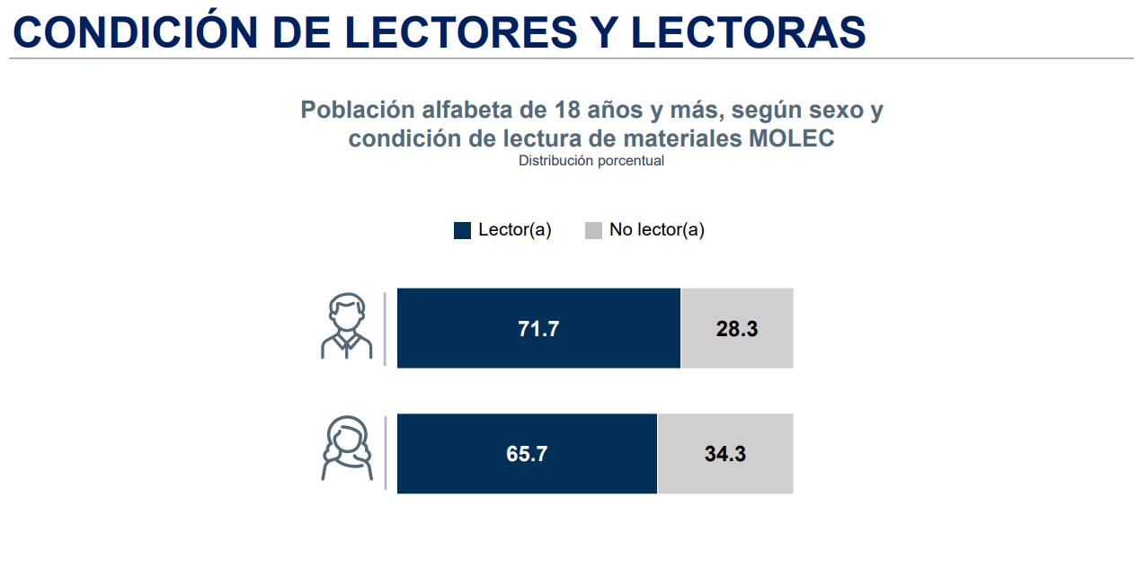 De acuerdo con los resultados del Módulo sobre Lectura, el porcentaje de hombres que declaró leer alguno de los materiales considerados por el Molec fue mayor que el de mujeres; 71.7 y 65.7 por ciento, respectivamente. Además revela que la población lectora disminuye conforme la edad avanza.