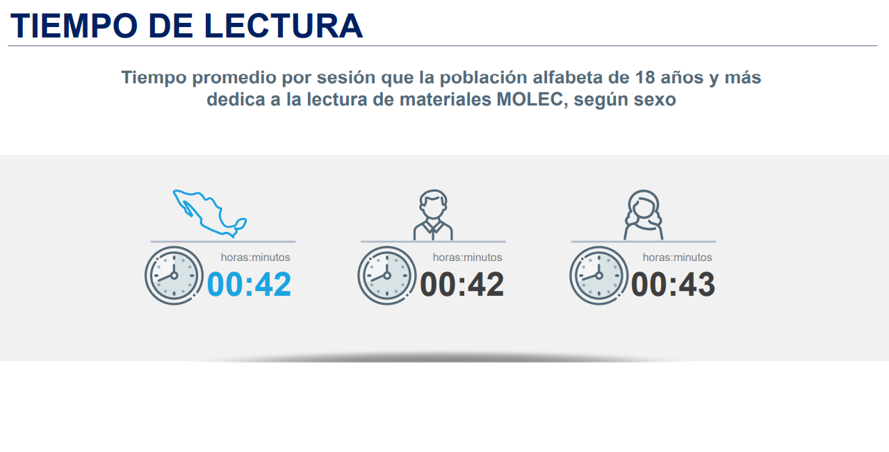 En cuanto al tiempo de una sesión continua de lectura, la población lectora de 18 años y más dedicó, en promedio, 42 minutos. El promedio fue similar entre hombres y mujeres.