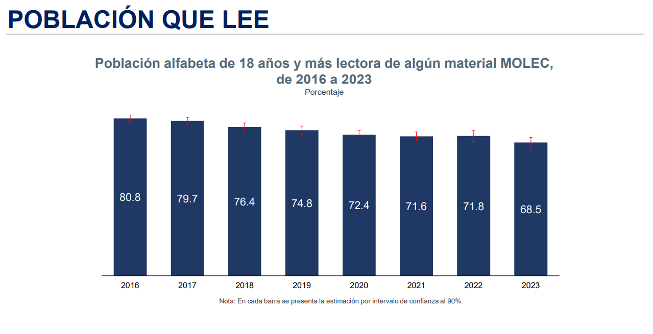 El Instituto Nacional de Estadística y Geografía (Inegi) dio a conocer los resultados del Módulo sobre Lectura 2023 en donde se muestra que el indicador ha continuado con una tendencia a la baja. En 2022 la cantidad ya había disminuido casi en 10 puntos respecto al 2016, para colocarse en 71.8 por ciento.