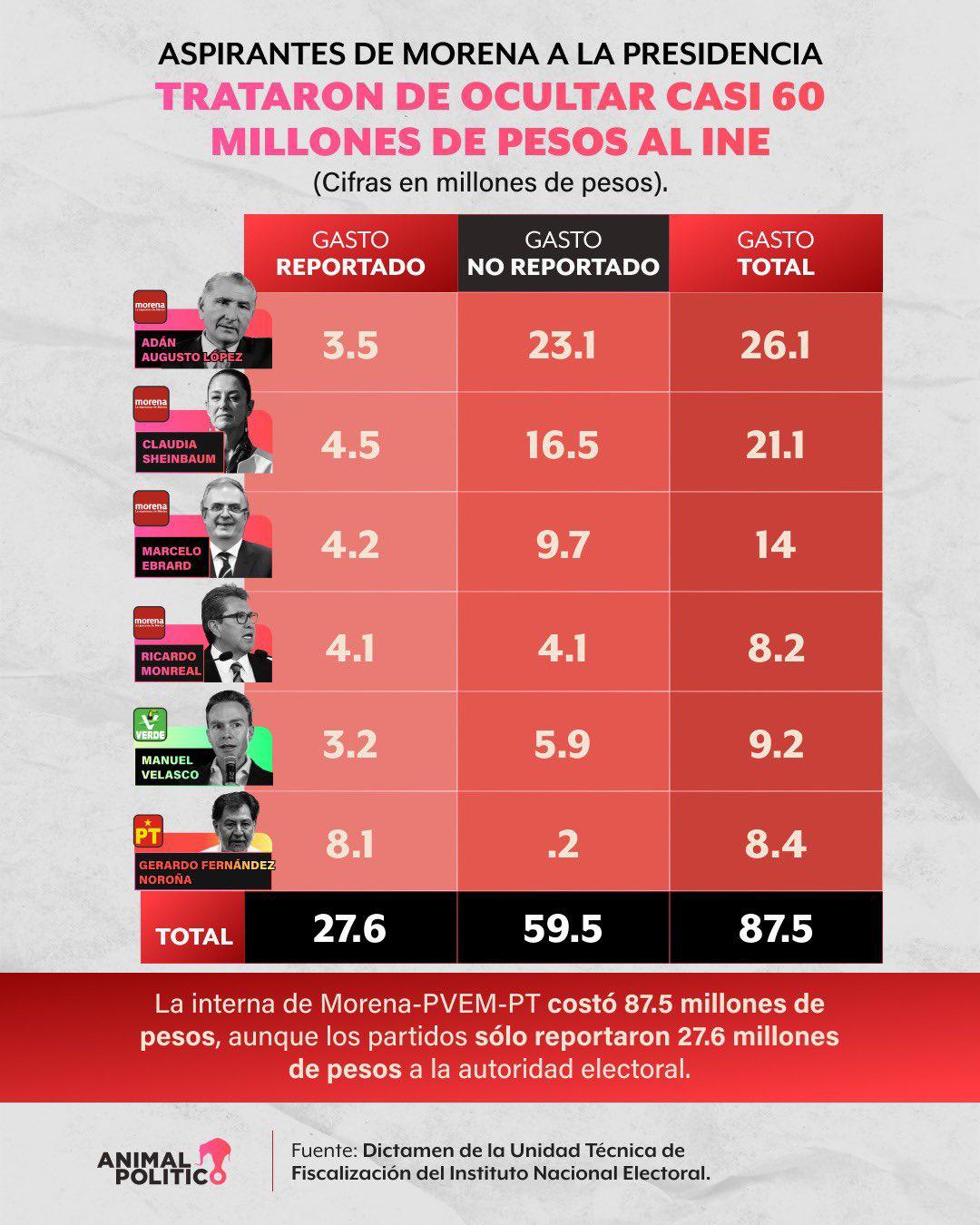 Solo en Morena, el gasto no reportado asciende a 53.5 millones de pesos. El partido informó al INE que se habían ejercido 16.5 millones de pesos, pero con los gastos detectados en las auditorías de la Unidad Técnica de Fiscalización, se determinó que el gasto total de los cuatro aspirantes fue de 70.1 millones de pesos.