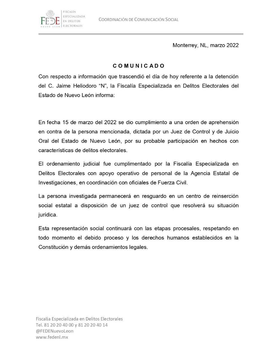 “En fecha 15 de marzo del 2022 se dio cumplimiento a una orden de aprehensión en contra de la persona mencionada, dictada por un Juez de Control y de Juicio Oral del Estado de Nuevo León, por su probable participación en hechos con características de delitos electorales”, dijo.