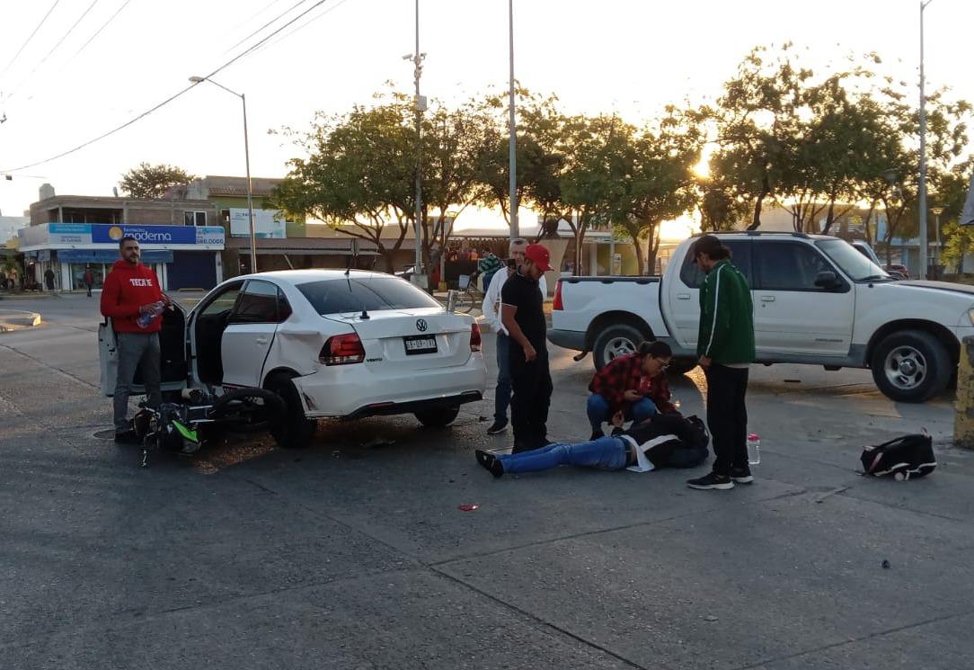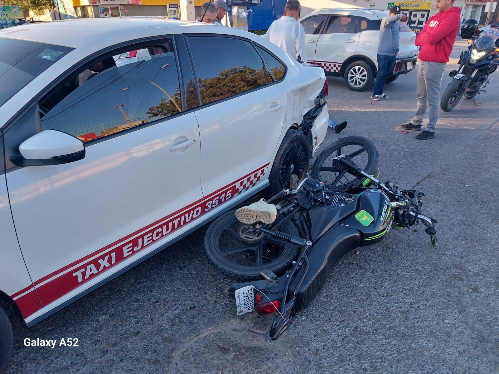MAZATLÁN._ Un motociclista resultó con probable fractura en una pierna tras chocar contra un taxi rojo en una glorieta del Parque Lineal.