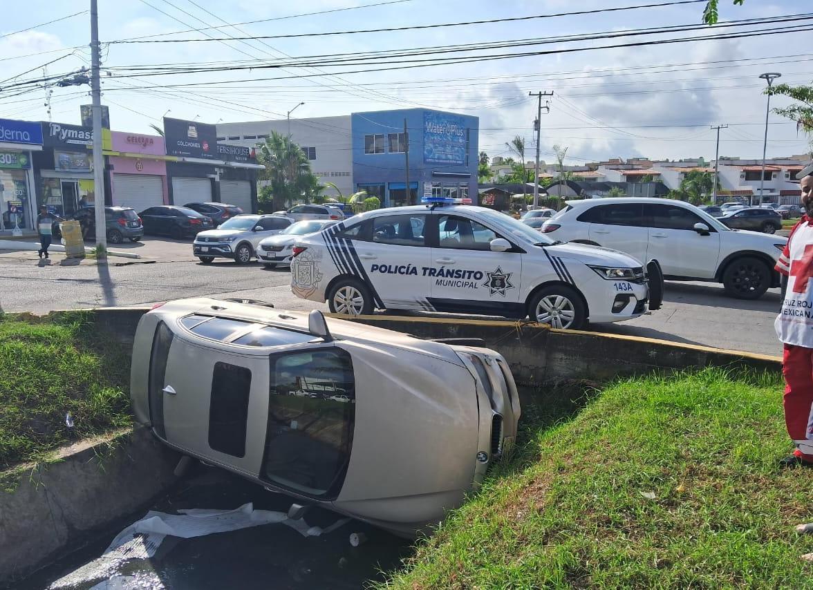 MAZATLÁN._ Un automóvil BMW quedó volcado sobre su costado derecho en un canal pluvial de la avenida La Marina, tras recibir un impacto de otro vehículo cuyo conductor se dio a la fuga.