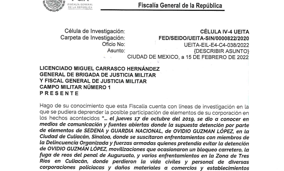 La Fiscalía General de la República tiene distintas líneas de investigación por los ataques y tiroteos del 17 de octubre de 2019, cuando se intentó detener a Ovidio Guzmán López en Culiacán, donde incluye a miembros del Ejército como presuntos responsables.