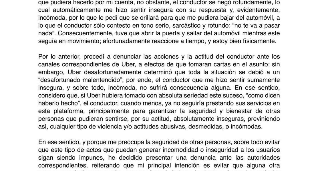 “Uber desafortunadamente determinó que toda la situación se debió a un ‘desafortunado malentendido’, por ende, el conductor que me hizo sentir sumamente insegura, y sobre todo, incómoda, no sufrirá consecuencia alguna (...) si Uber hubiera tomado con absoluta seriedad este suceso, ‘como dicen haberlo hecho’, el conductor, cuando menos, ya no seguiría prestando sus servicios en esta plataforma, principalmente para garantizar la seguridad y bienestar de otras personas que pudieran sentirse”, escribió en su misiva.