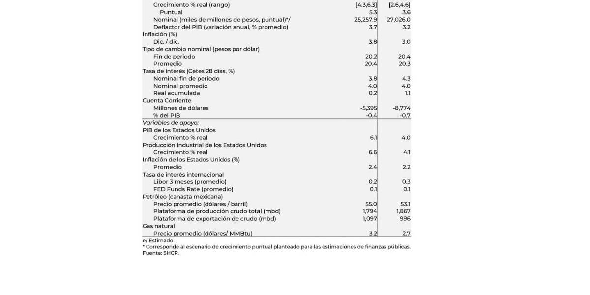 Esta nueva estimación sustituye la proyección prevista en el Paquete Económico 2021, que situaba el pronóstico de crecimiento del Producto Interno Bruto, en un rango de 3.6 a 5.6 por ciento y un crecimiento económico puntual de 4.6 por ciento para efecto de las estimaciones de finanzas públicas.
