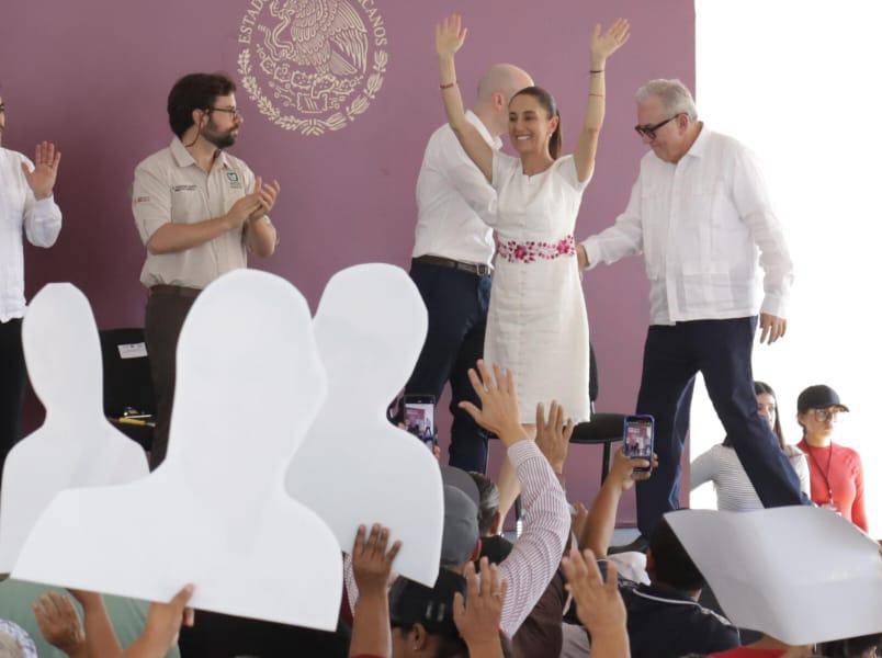 Al ritmo de música de banda y aplausos, la Presidenta de México es recibida por cientos de personas