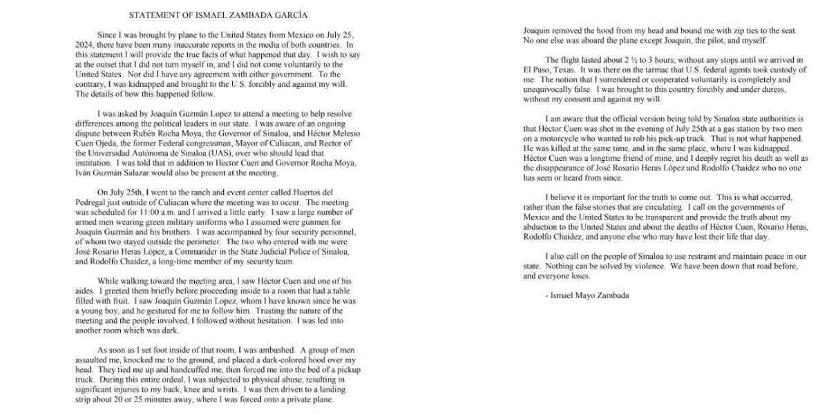“Desde que fui traído en avión a Estados Unidos desde México el 25 de julio de 2024, ha habido muchos informes inexactos en los medios de ambos países. En esta declaración brindaré los hechos reales de lo que sucedió ese día. Deseo decir desde el principio que no me entregué ni vine voluntariamente a los Estados Unidos. Tampoco tuve ningún acuerdo con ninguno de los gobiernos. Al contrario, fui secuestrado y traído a Estados Unidos por la fuerza y en contra de mi voluntad. Los detalles de cómo sucedió esto a continuación.