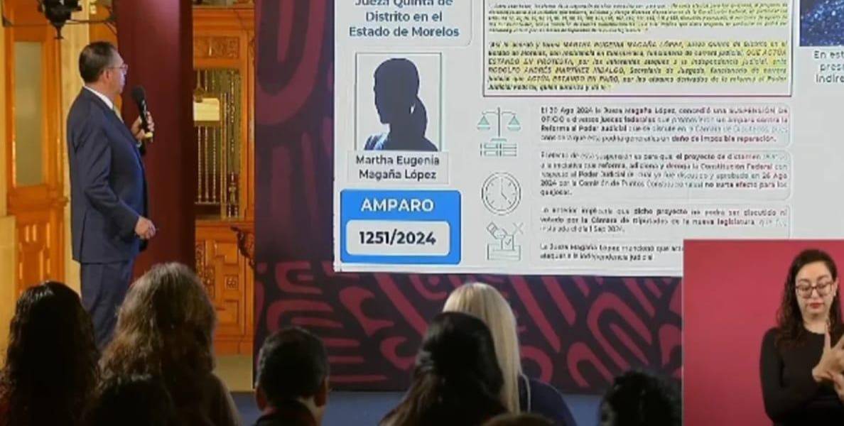 “El 30 de agosto 2024 la jueza Magaña López concedió una suspensión de oficio a diversos jueces federales que promovieron un amparo contra la reforma al Poder Judicial que se discute en la Cámara de Diputados, pues considera que este podría generarles un daño de imposible reparación”, se leía en la gráfica que estaba en las pantallas de Palacio Nacional.