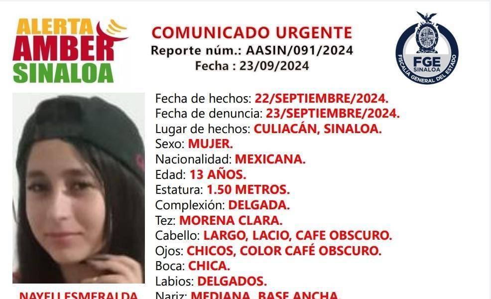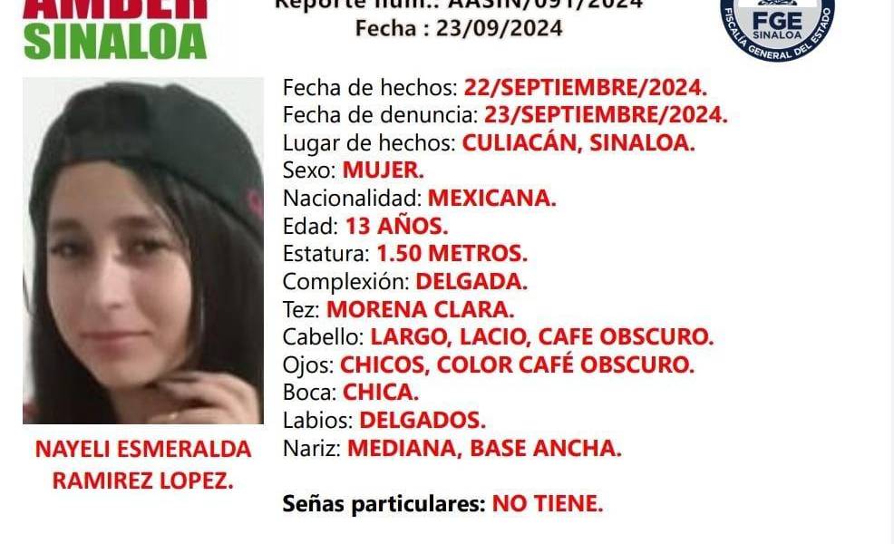 CULIACÁN._ La Fiscalía General del Estado activó una ficha de búsqueda para localizar a la adolescente, de 13 años, Nayeli Esmeralda Ramírez López, desaparecida el 22 de septiembre del presente año en la ciudad de Culiacán.