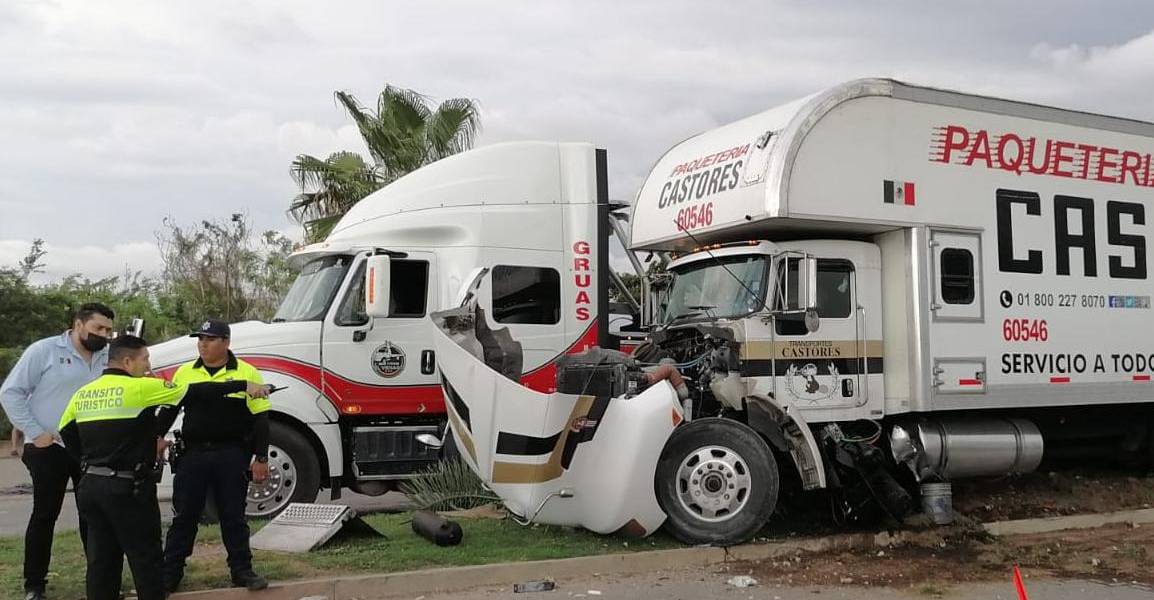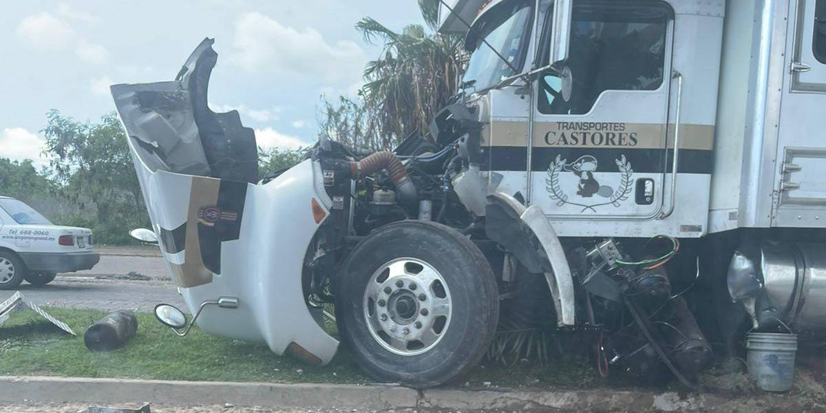 MAZATLÁN._ Un tractocamión de paquetería y mensajería chocó contra una palmera sobre la Avenida Sábalo Cerritos, bajando el segundo puente de La Marina, este jueves, y está provocando un caos vial.