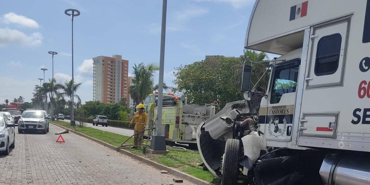El camión perdió el control, por un fuerte derrame de combustible, y chocó contra una palmera ubicada en el camellón central de la Avenida Sábalo Cerritos; tome sus precauciones