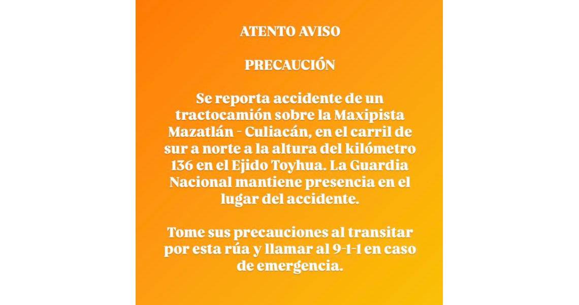 Durante el mediodía de este viernes se registró un accidente de un tráiler sobre la autopista Mazatlán-Culiacán, por lo que quienes transitan por ahí deben tomar precauciones.