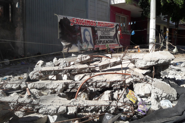 A un año de distancia la calle Madero, entre el callejón Cuauhtémoc y la Colón, permanece cerrada. Sobre el pavimento frente al lugar de la explosión siguen tirados los escombros y sobre estos una lona con la fotografía de Iris con la exigencia de justicia y de explicaciones.