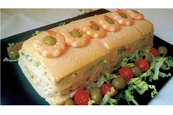 Al día siguiente, desenvuelve con cuidado y desmolda sobre la bandeja de servir, quita el film con cuidado y decora: cubre por completo con mayonesa, adorna con unas tiras de pimiento verde y zanahorias, simulando unas flores, aceitunas en el borde y listo para servir.