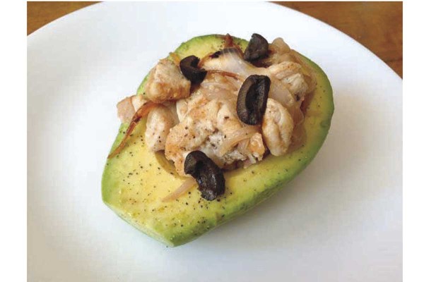 - Rellena las mitades del aguacate con el sofrito de pollo y decora con unas aceitunas cortadas por la mitad. Los aguacates rellenos de pollo los puedes comer en la cena.
